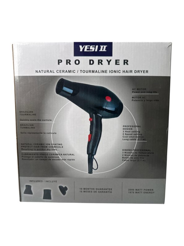 Secador PRO DRYER “INALCANZABLE”. Con sus 2000 Watt excelentemente controlados. su capacidad de aire, equilibrio y robustez está entre las máximos expresiones que la técnica actual pueda proponer. Compacto, versátiles, son concepciones ya habituales con los secadores YESI de ultima generación. YESI PRO DRYER esta acompañada por las nuevas 2 boquillas, y 1 excelente Difusor, que es empotrado en la boquilla y se ajusta automáticamente