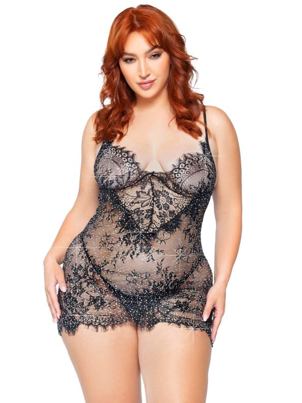 Conjunto de lencería de talla grande presenta brillantes diamantes de imitación sobre una delicada tela de encaje negro para una apariencia inolvidablemente sexy.