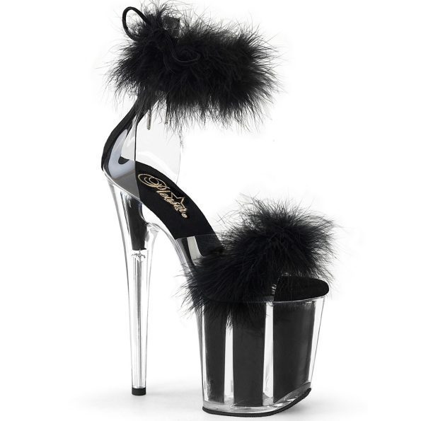 Zapatilla de Pol Dance con 20 cm de tacón, 10 cm de plataforma y con sujetador ajustable de tobillo, detalles de plumas en el sujetador, empeine y dentro de la plataforma en color negro.