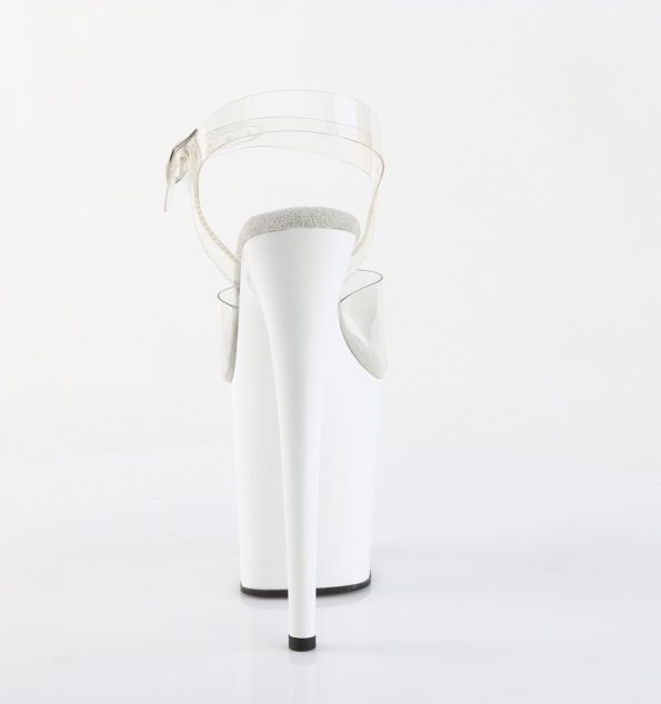 Zapatilla de Pol Dance con 20 cm de tacón, 10 cm de plataforma y con sujetador en el tobillo, con plataforma de color blanco y mica transparente.