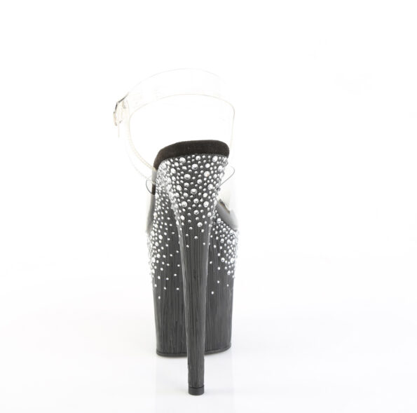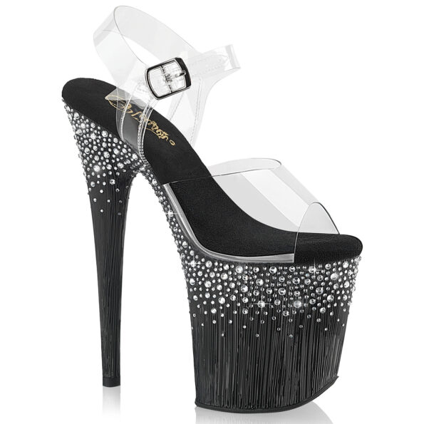 Zapatilla de Pole Dance con 20 cm de tacón, 10 cm de plataforma y con sujetador en el tobillo. Con pedrería en relieve en una combinación negro-plata.